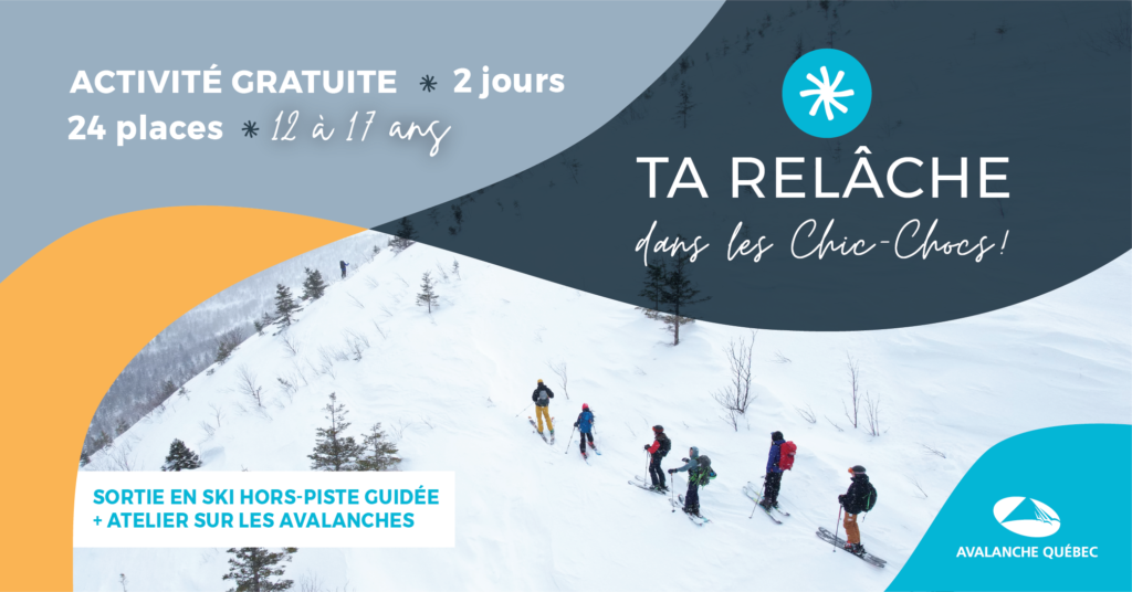 *** Activité annulé dû aux mauvaises conditions du manteau neigeux et météorologiques de l’hiver 2023-2024. *** Une troisième édition de l’activité Jeunes en montagne est lancée ! Avalanche Québec organise une activité toute spéciale pour les jeunes de 12 à 17 ans qui sont passionnés des sports de glisse dans l’arrière-pays. L’activité …